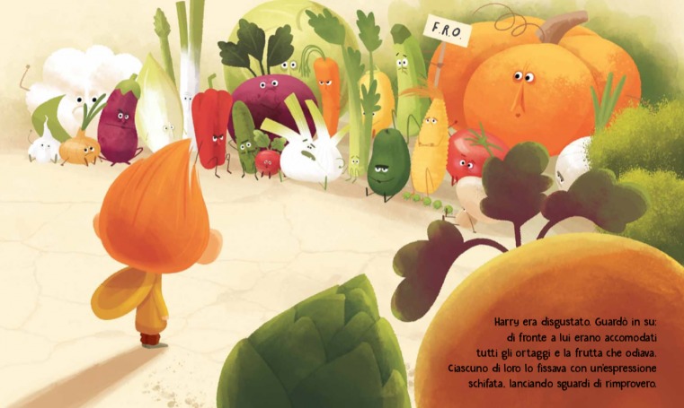 Harry detesta quasi irrimediabilmente e le verdure. Trova le carote disgustose, cattivissime le zucchine, nauseanti i pomodori che continuano a invadere la sua tavola. Un giorno, che rabbia … arriva la goccia che fa traboccare il vaso, Il suo piatto è infestato dai fastidiosissimi cavoletti di Bruxelles! Harry salta la cena davvero indispettito. Ma … le verdure si vendicano e lo mettono sotto processo! Nel libro scoprirete come il bambino riuscirà a fare pace con gli ortaggi. Una bella storia come un piccolo cortometraggio che, con leggerezza e simpatia, aiuta i bambini ad apprezzare i piatti sani e a superare le piccole grandi difficoltà di mangiare le verdure.