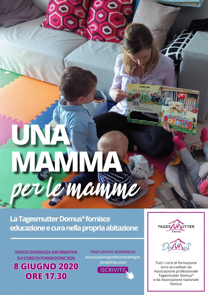 Il prossimo 8 giugno 2020 alle ore 17.30, l’Associazione Professionale Tagesmutter Domus® propone una videoconferenza informativa alla quale partecipare se interessate a diventare Tagesmutter.