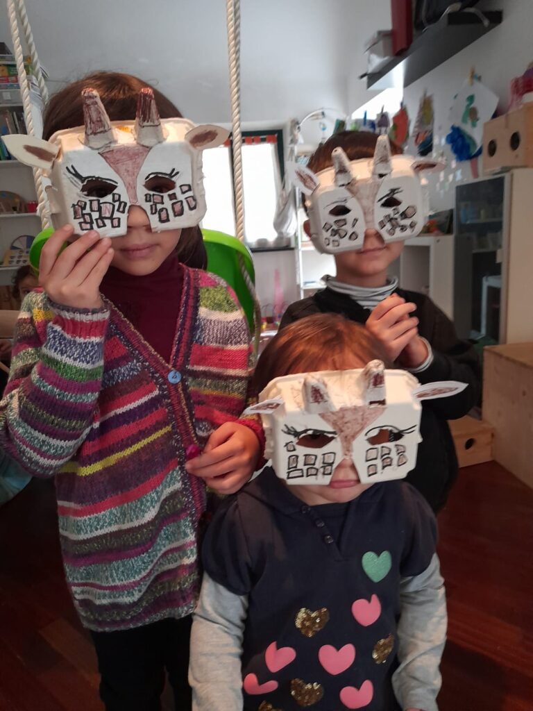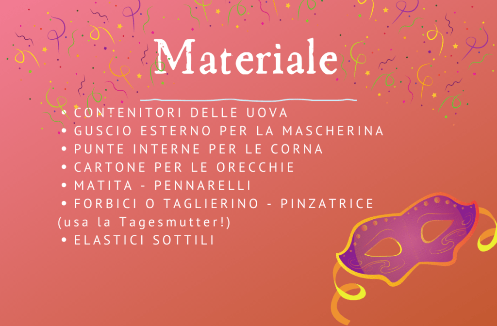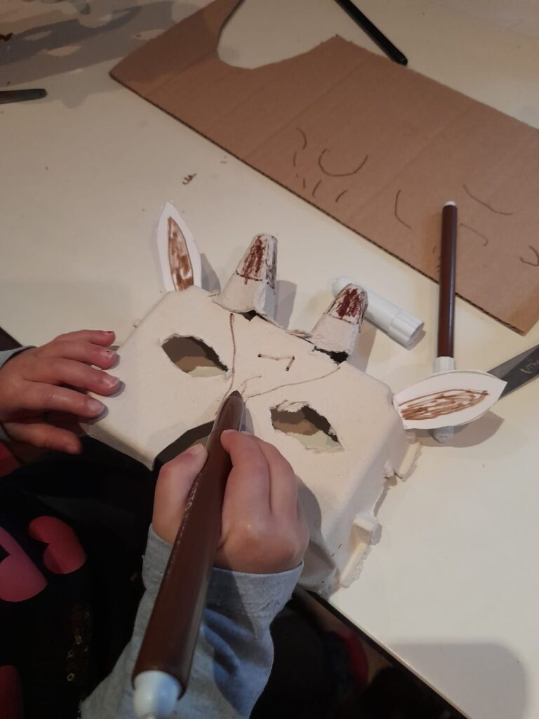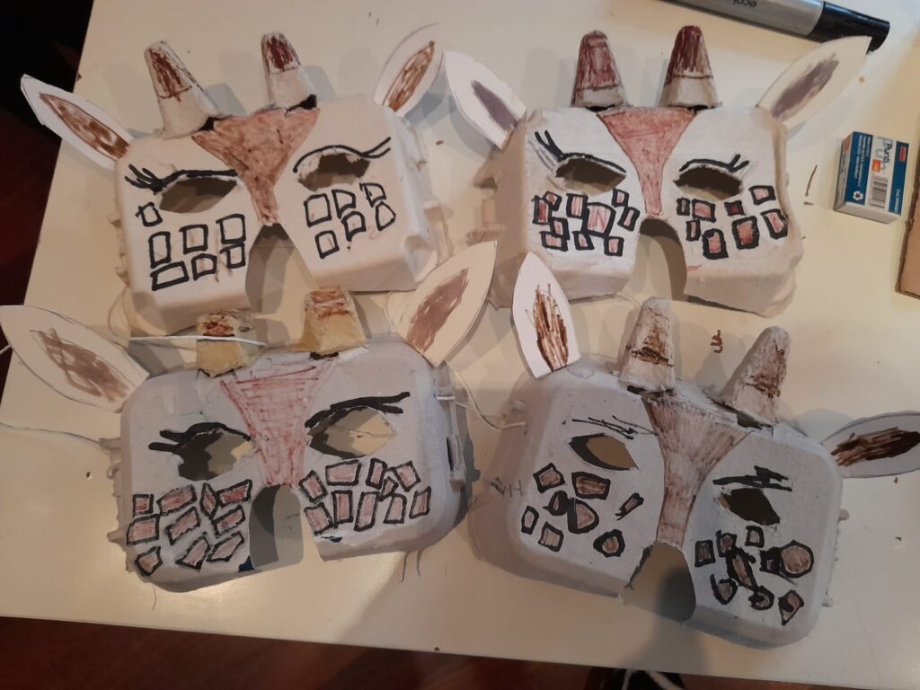 🦒La parte sopra del contenitore sarà la mascherina 🦒Disegnare la forma degli occhi e ritagliare 🦒 Le due punte alte all’interno del contenitore saranno le piccole corna 🦒Usare del cartone per le orecchie 🦒Assemblare il tutto con l’aiuto della pinzatrice 🦒 Mettere due elastici per legare le maschere al viso e… via a tirare coriandoli!!!!
