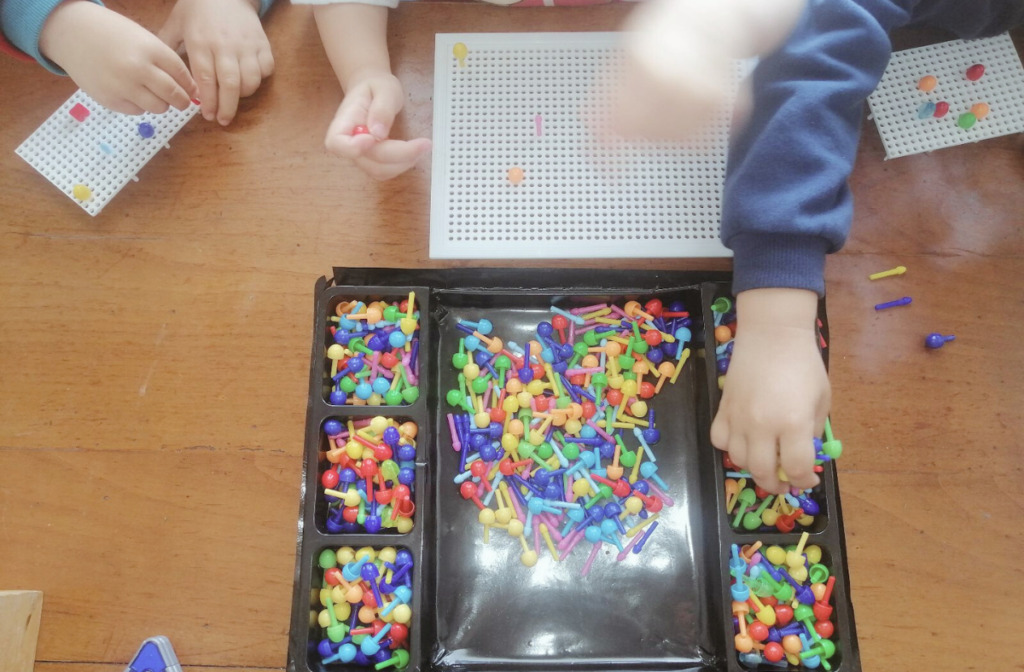 In casa predisponiamo l’ambiente per i nostri laboratori artistici, utilizziamo piccole parti di ortaggi come timbri, creiamo scatole rumorose con le foglie secche, percorsi sensoriali con diversi materiali posizionati in differenti contenitori.