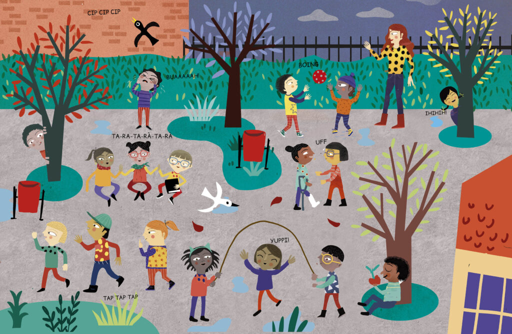 “Un albo senza parole, o quasi: le uniche parole sono le onomatopee che raccontano tutti i rumori della ordinaria giornata di un bambino. Svegliarsi e prepararsi per uscire, andare a scuola, giocare, fare il riposino, e poi la piscina, il ritorno a casa, la sera in famiglia … Sembra che in tutta la giornata non ci sia mai un momento di vero silenzio! Eppure esiste un momento speciale in cui è possibile spegnere tutti i rumori. Quando arriva, si entra di colpo in un mondo del tutto diverso. Succede quando si apre un libro …”