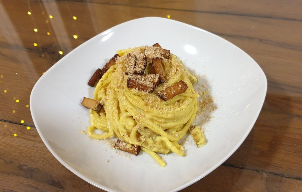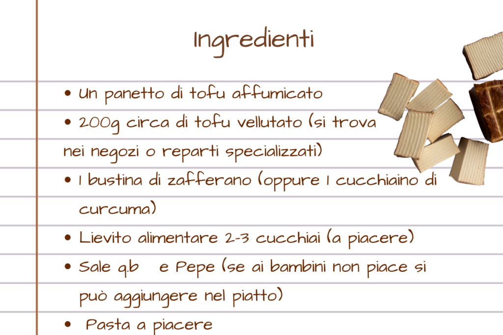 🍴Tagliare a cubetti il tofu affumicato e farlo rosolare con un po’ di olio in padella antiaderente girandolo di tanto in tanto, fino a doratura. 🍴Mettere la pasta, cuocere e nel frattempo frullare il Tofu Vellutato insieme al lievito alimentare, all’olio, al sale, (volendo anche aglio in polvere) e allo zafferano. 🍴Se necessario, allungare con poca acqua di cottura. 🍴Poi unire il tofu affumicato cotto precedentemente a questa crema e usare il tutto per condire la pasta.