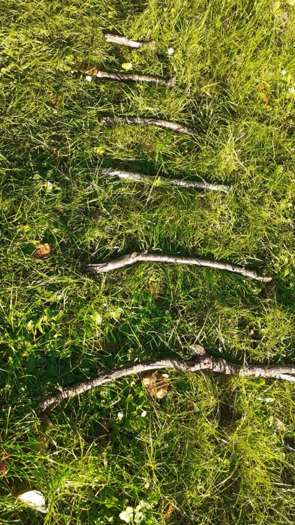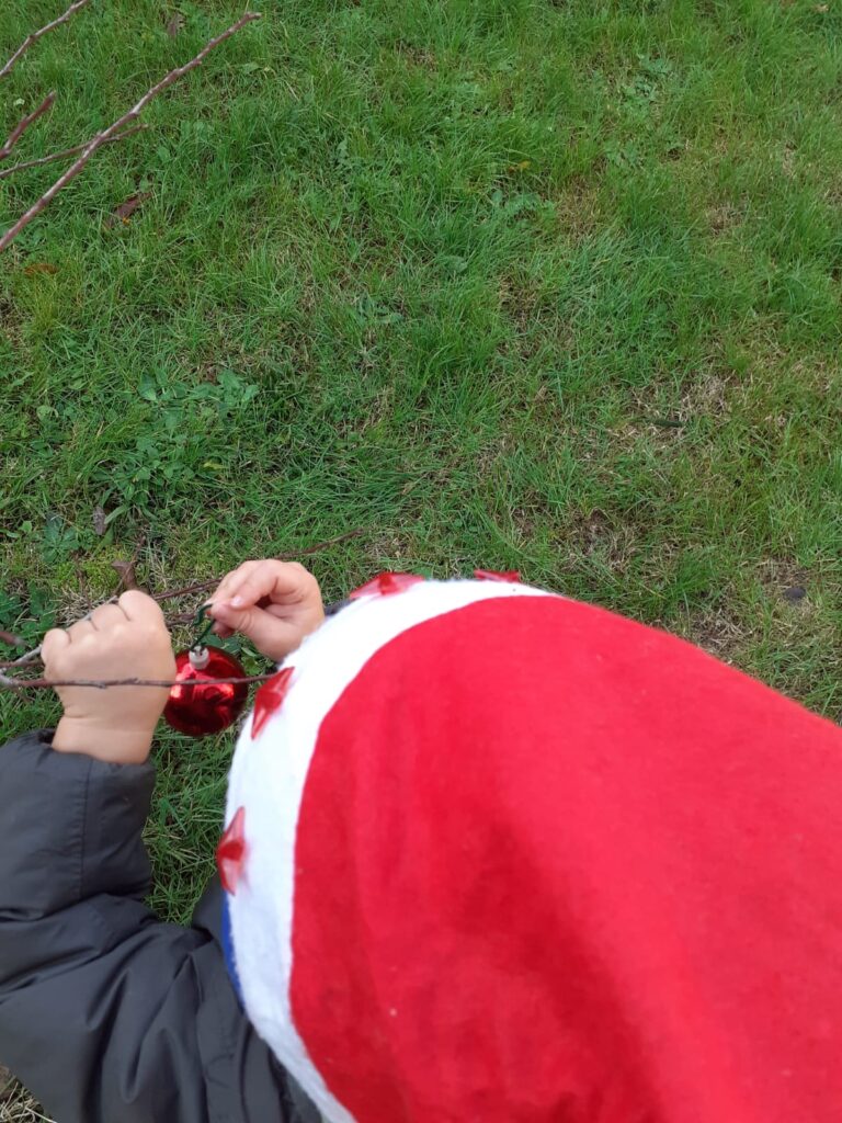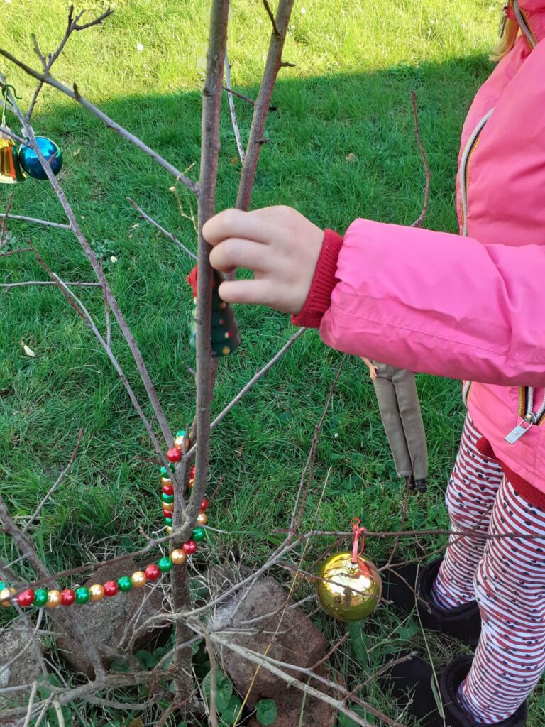 “Con i bambini ci divertiamo sempre molto a “trafficare” in giardino a raccogliere rametti, fiori e foglie, in preparazione a questo Natale abbiamo provato a mettere in fila dei legnetti a formare un albero di Natale e legarlo con due cordini: ecco fatto un abete , poi con qualche pallina lo abbiamo abbellito.