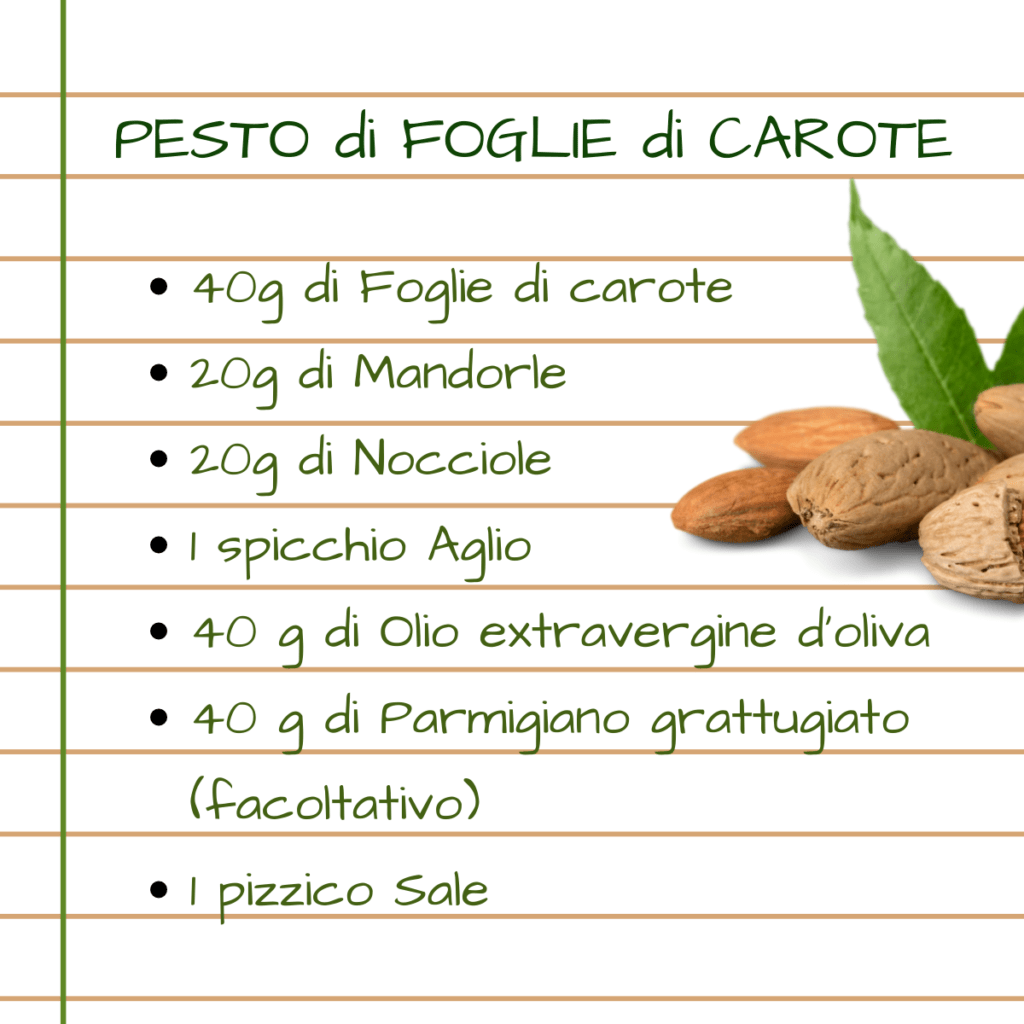 🥕 Lavare bene le foglie di carota (eliminare i gambi che risulterebbero troppo duri e usare solo le foglie tenere) in abbondante acqua fresca 🥕Farle sgocciolare e asciugare con un canovaccio 🥕Nel vostro frullatore mettete le mandorle e le noci, lo spicchio d’aglio sbucciato e le foglie di carota 🥕Aggiungere l’olio, un bel pizzico di sale e un paio di cucchiai di acqua 🥕Frullate a impulsi fino a che tutti gli ingredienti si sono amalgamati 🥕Se necessario unire un altro goccio d’acqua o di olio e continuare a frullare fino a raggiungere la consistenza desiderata 🥕Aggiungere il parmigiano grattugiato (se lo desiderate) e mescolare con un cucchiaio