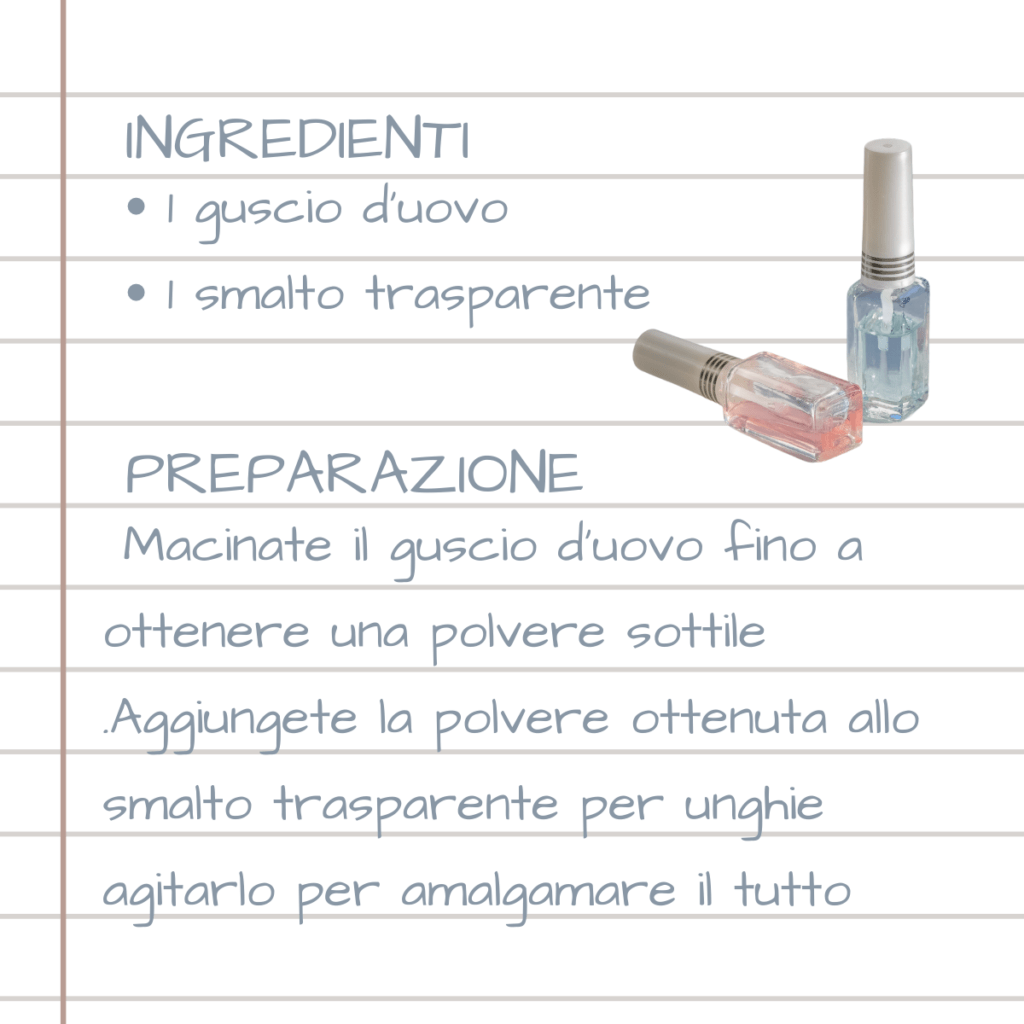 I gusci delle uova contengono una gran quantità di calcio. E allora perché non preparare un buon rinforzante naturale per le unghie? Se avete problemi di fragilità delle unghie volete rinforzarle, seguite la ricetta e impegnatevi alla costanza del trattamento.