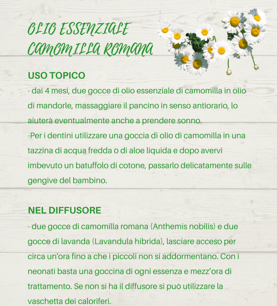 L’olio essenziale di camomilla romana calma i sentimenti di rabbia e agitazione, dona pace e favorisce la comunicazione. E’ indicato per mettere ordine nei delicati pensieri dei bambini che tendono a dire qualche bugia o per semplici coccole e massaggi e per alleviare i dolori causati dalle coliche neonatali o dai primi dentini che spuntano.