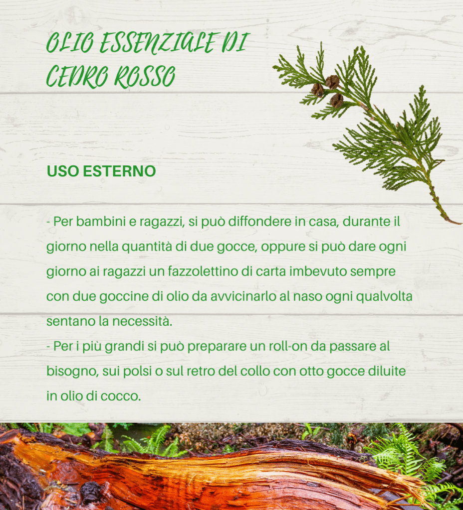 L’olio essenziale di legno di cedro ha un forte potere antistress, favorisce l’equilibrio emozionale e agevola il senso di unione, socialità e cooperazione. Molto utile per bambini e ragazzi in questo momento di nuovi importanti inizi tra percorsi scolastici, sport ed altre attività. Inoltre l’ olio essenziale di legno di cedro rosso allenta il senso di competizione, quando quest’ultima rischia di diventare una fonte di stress.