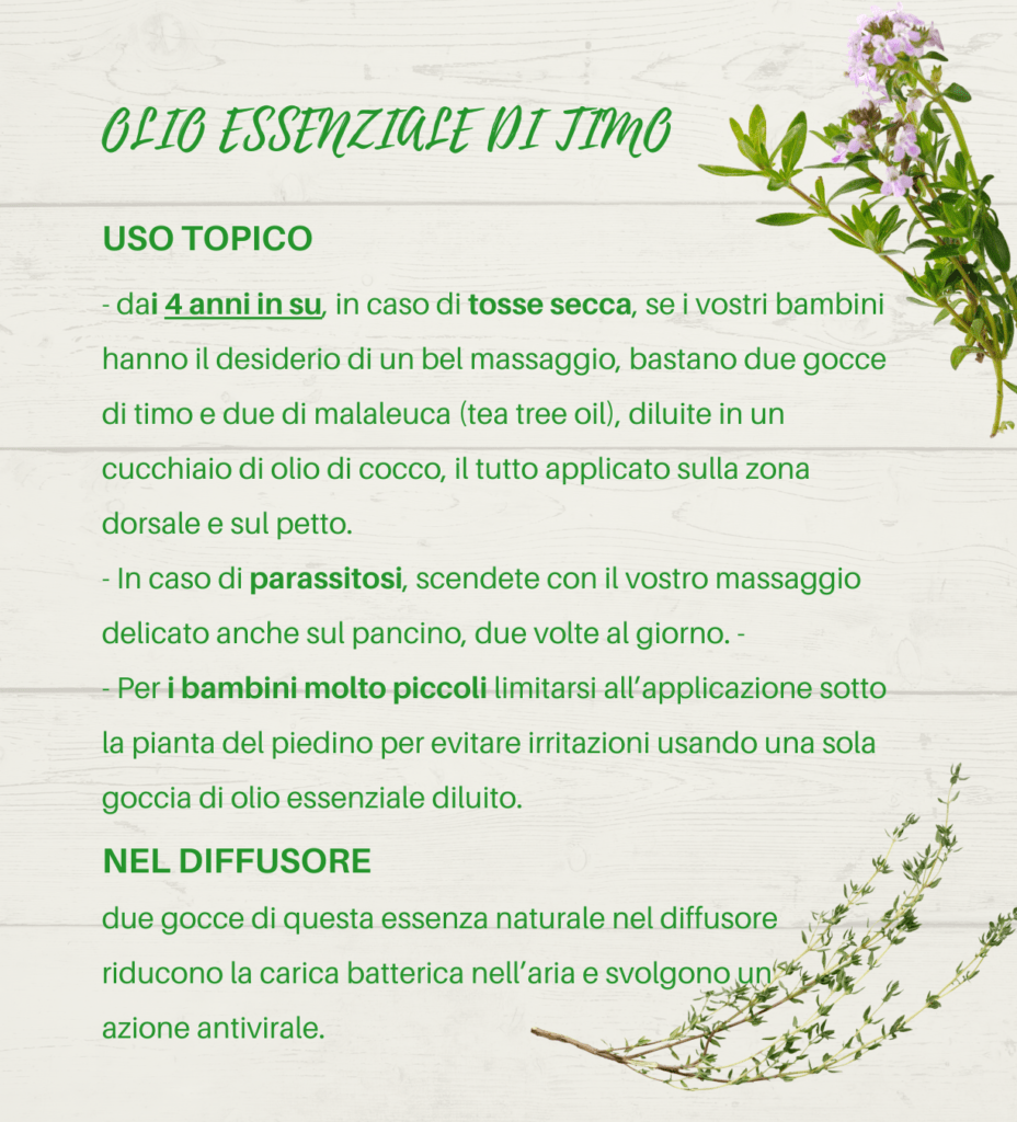 Il timo è un potente espettorante in caso di tosse secca ed è un coadiuvante molto utile nelle cure per le infezioni delle vie respiratorie, inoltre essendo un eccellente antiparassitario e antimicotico, svolge una potente azione sul fungo della “candida albicans”.