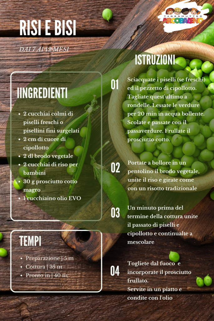 Tutti i sapori dei piatti dei grandi, ma con le attenzioni necessarie per i nostri piccoli, il risi e bisi diventa un risottino al passato di piselli, da proporre a partire dai 7 mesi. La cottura a “risotto” renderà gustoso il piatto, il prosciutto cotto darà gusto e renderà completo il pasto.